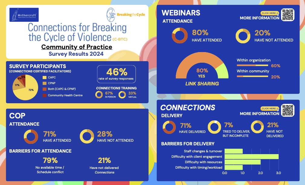 Mothercraft a continué à intensifier la mise en œuvre du projet Connections pour les mères et les enfants subissant de la violence dans les relations ainsi que l’évaluation du projet dans le cadre du projet C-BTC. C-BTC améliore l’accès à une intervention de groupe contre la violence interpersonnelle pour les femmes enceintes et les mères de jeunes enfants subissant de la violence familiale grâce à la collaboration avec des partenaires communautaires partout au Canada. L’évaluation du projet C-BTC permettra d’accroître la base de données probantes pour Connections et ses approches, à confirmer son impact au fil du temps, et à identifier les mécanismes de changement observés chez les femmes enceintes et les mères qui ont participé à l’intervention.
